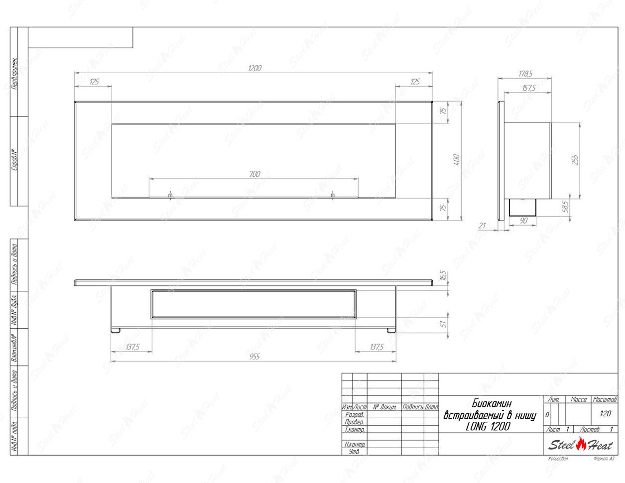 Встраиваемый Биокамин SteelHeat LONG 1200 предназначен для встраивания в глухие ниши из гипсокартона, кирпича, пеноблоков, бетона.
